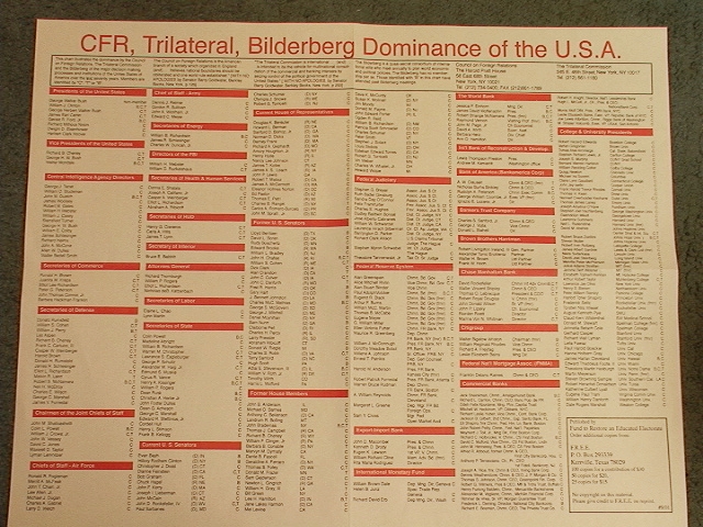 Under Red headings of 'College & University Presidents', 'The World Bank', etc, are listed names with up to three abbreviations showing who belonged to the Trilateral Commission, the Bilderberg, or the Council on Foreign Relations. Unfolded, it measured 17" by 22"; the front 'documented' CFR, Trilateral, Bilderberg Dominance of the U.S.A'; the back "$$THE BIGGEST GAME IN TOWN$$", 'The Comprehensive Annual Financial Report Exposed' by Walter J. Burien, Jr. A quick search for the author on Google is as far as I can make myself, and virtually every link is to his article about the CAFR. The Web was made for conspiracies.